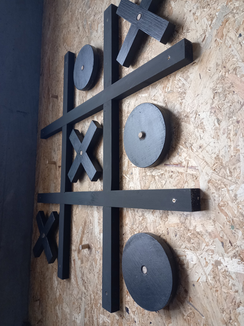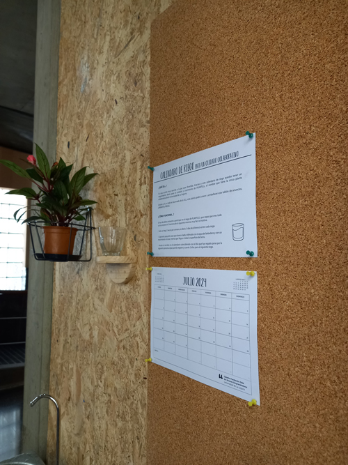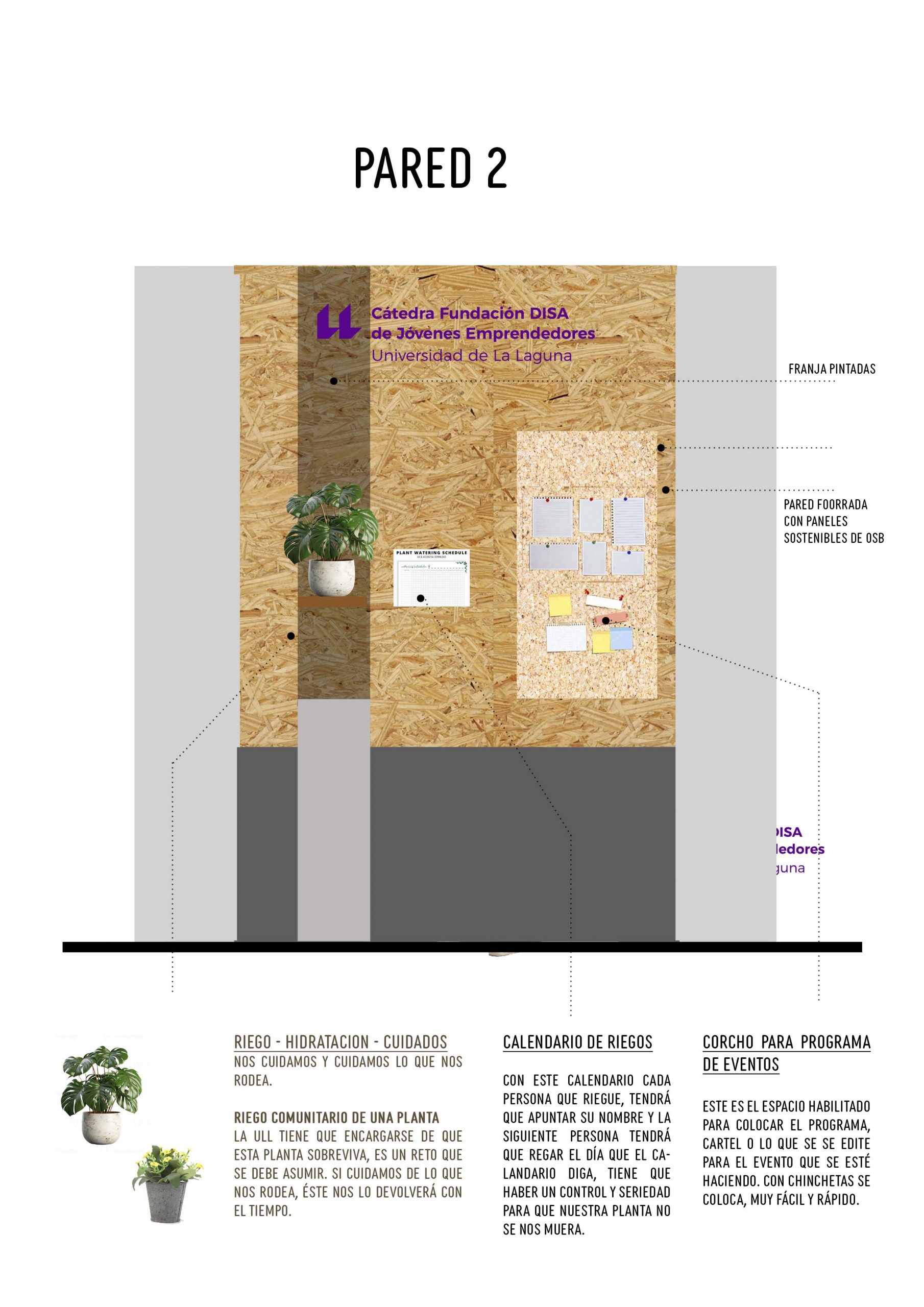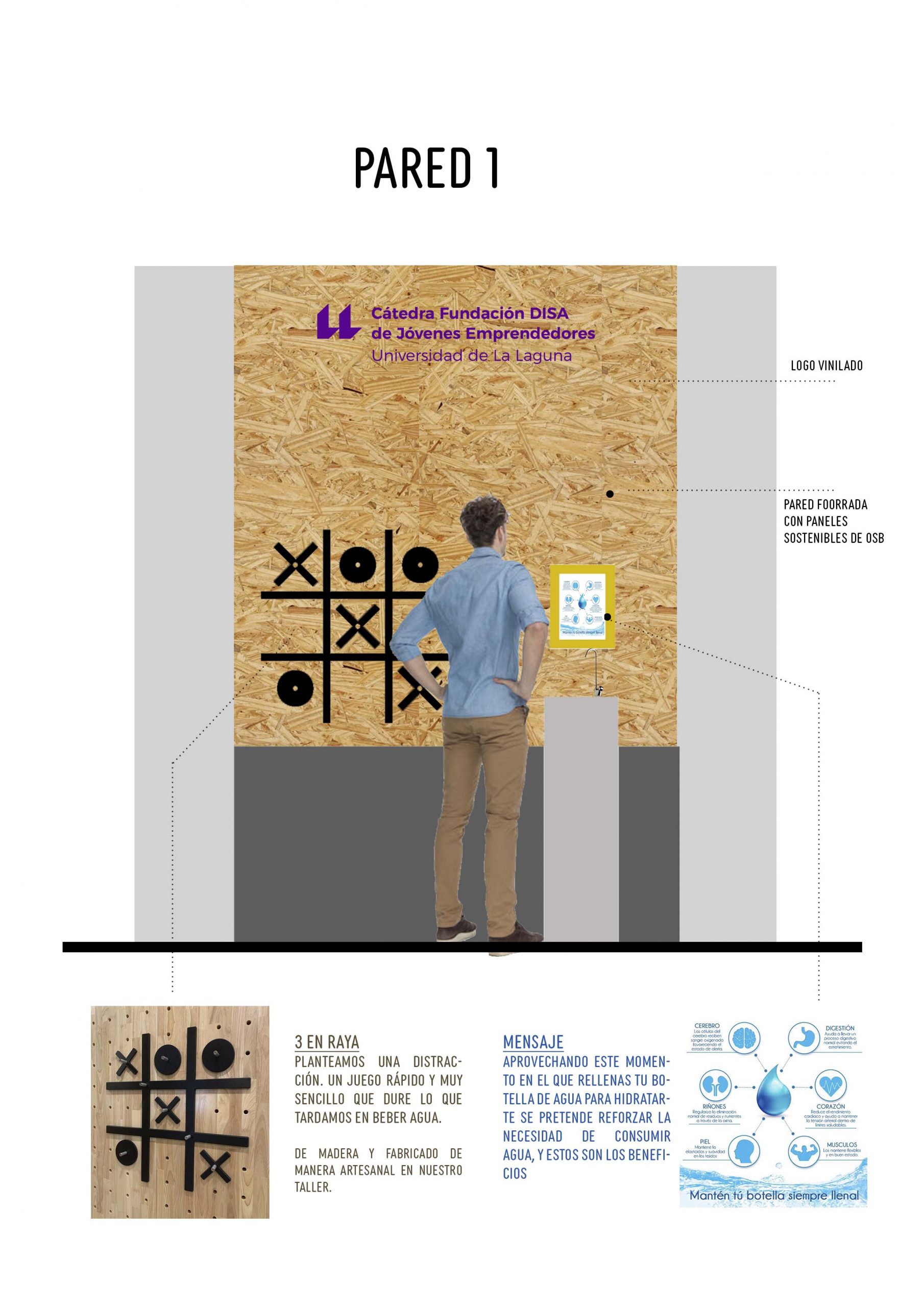 Para ello, usamos los paneles de madera de OSB para tapar los huecos que existían en esa pared, material que no sólo permite decorar la pared sino que nos permite anclar elementos sin perjudicar la pared que ya contaba con muchos agujeros.  Encima de estos paneles, ubicamos por un lado un lugar de diversión con un 3 en Raya Gigante para que el alumnado pudiera jugar en los ratos libres y en la otra pared un espacio de riego colaborativo, donde las personas que lo deseen pueden animarse a regar con un vasito muy pequeño una planta.