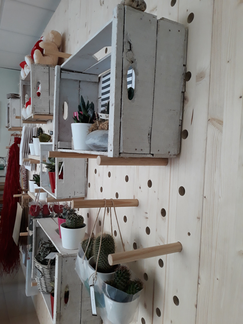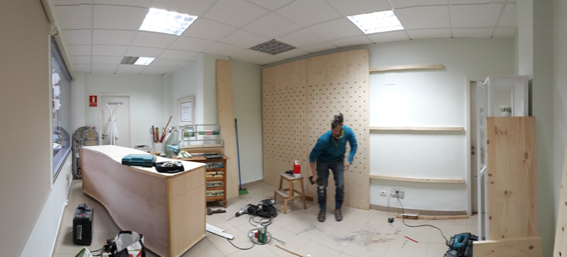 Un proyecto muy sencillo que pretende hacer un lavado de cara con panelados de madera ECO, de pino encolado, con más de 500 agujeros para introducir unos palos de madera de pino y que sobre ellos apoyaran distintas tablas, repisas y cajas de madera para colocar las flores y artículos de decoración de la floristería. Un mostrador curvo diseñado y totalmente fabricado con maderas sostenibles, recicladas y reutilizadas de otros trabajos. También se fabricaron unas mesas-estantes abatibles.