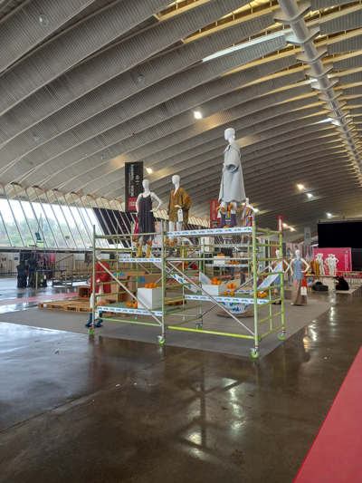 Para desarrollar este proyecto utilizamos andamios, maniquies, mobiliario de cartón reciclado, palets y una mesa de trabajo fabricada con una bobina de electricidad.